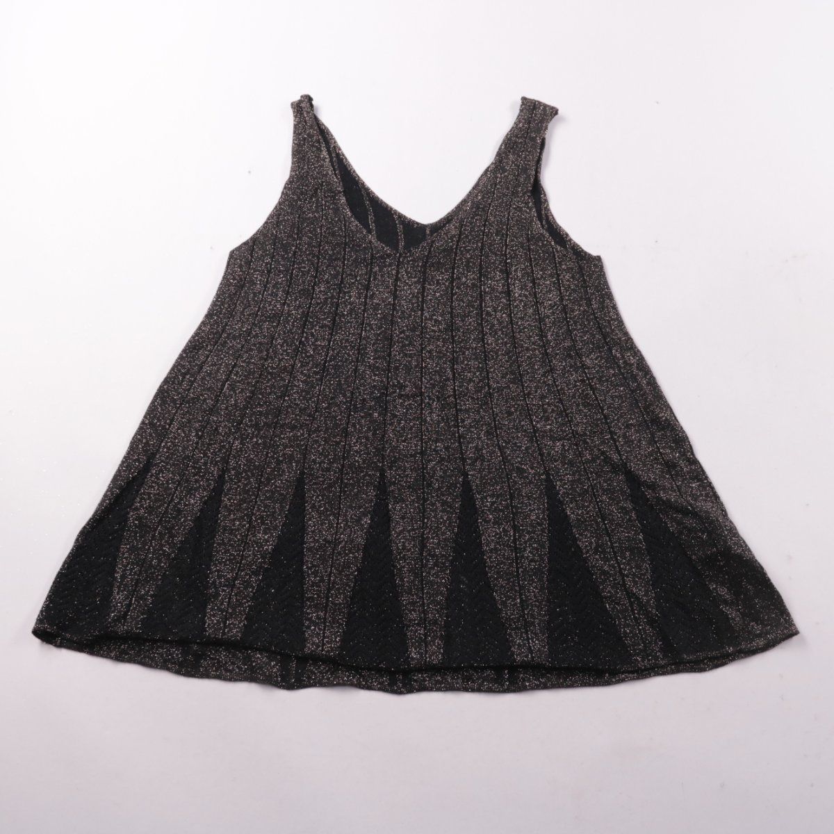 Топ Next чёрного цвета с серебристым люрексом, на широких бретелях и с V-образным вырезом. Подойдёт для вечерних выходов и нарядных образов с юбкой или брюками. Ткань лёгкая и хорошо тянется за счёт фактуры.