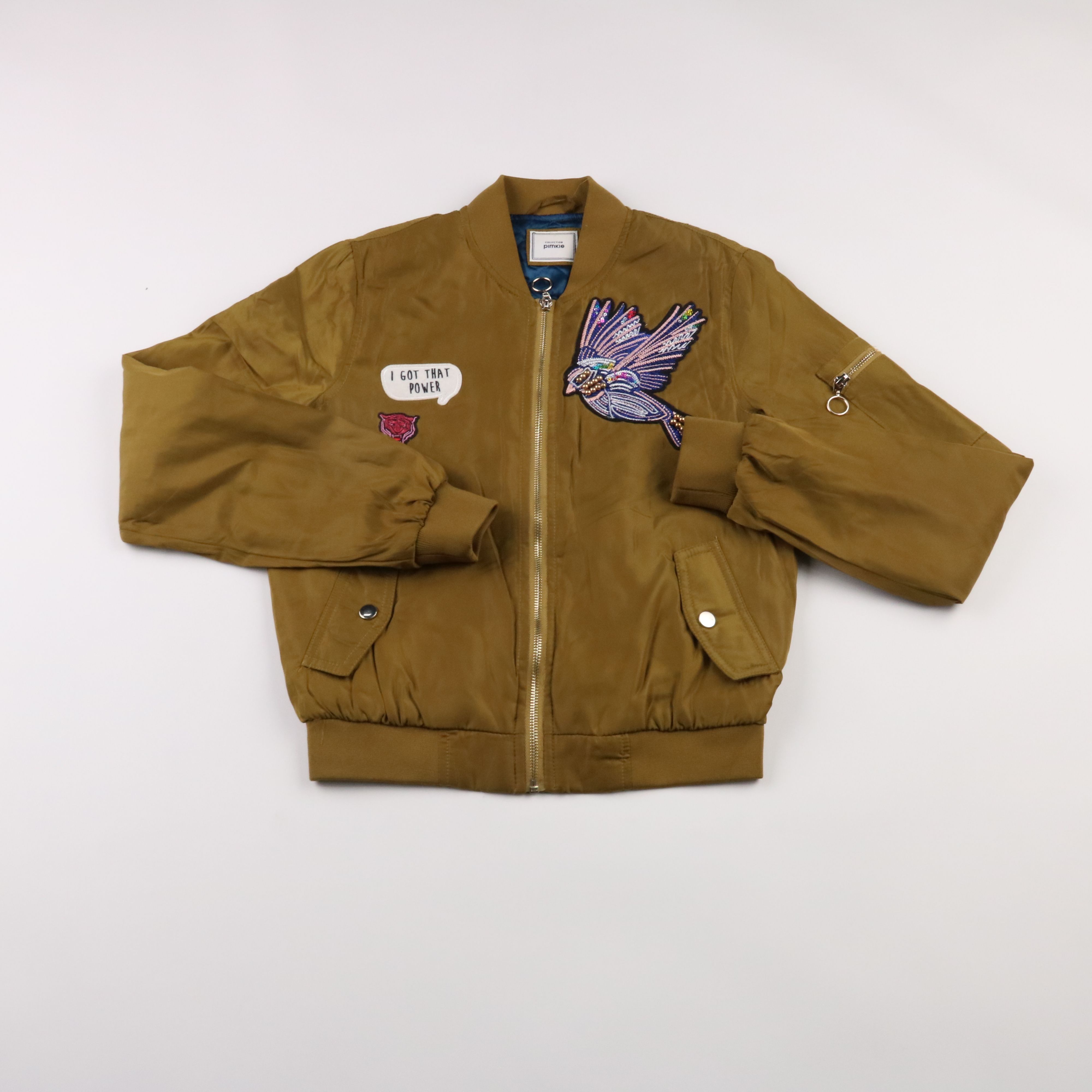 Женский бомбер Pimkie в цвете хаки с яркими нашивками (птица и патчи) и застёжкой на молнию. Подойдёт для демисезона и прохладных летних вечеров, хорошо смотрится с джинсами и кедами. Практичные карманы с клапанами и карман на рукаве добавляют удобства.
