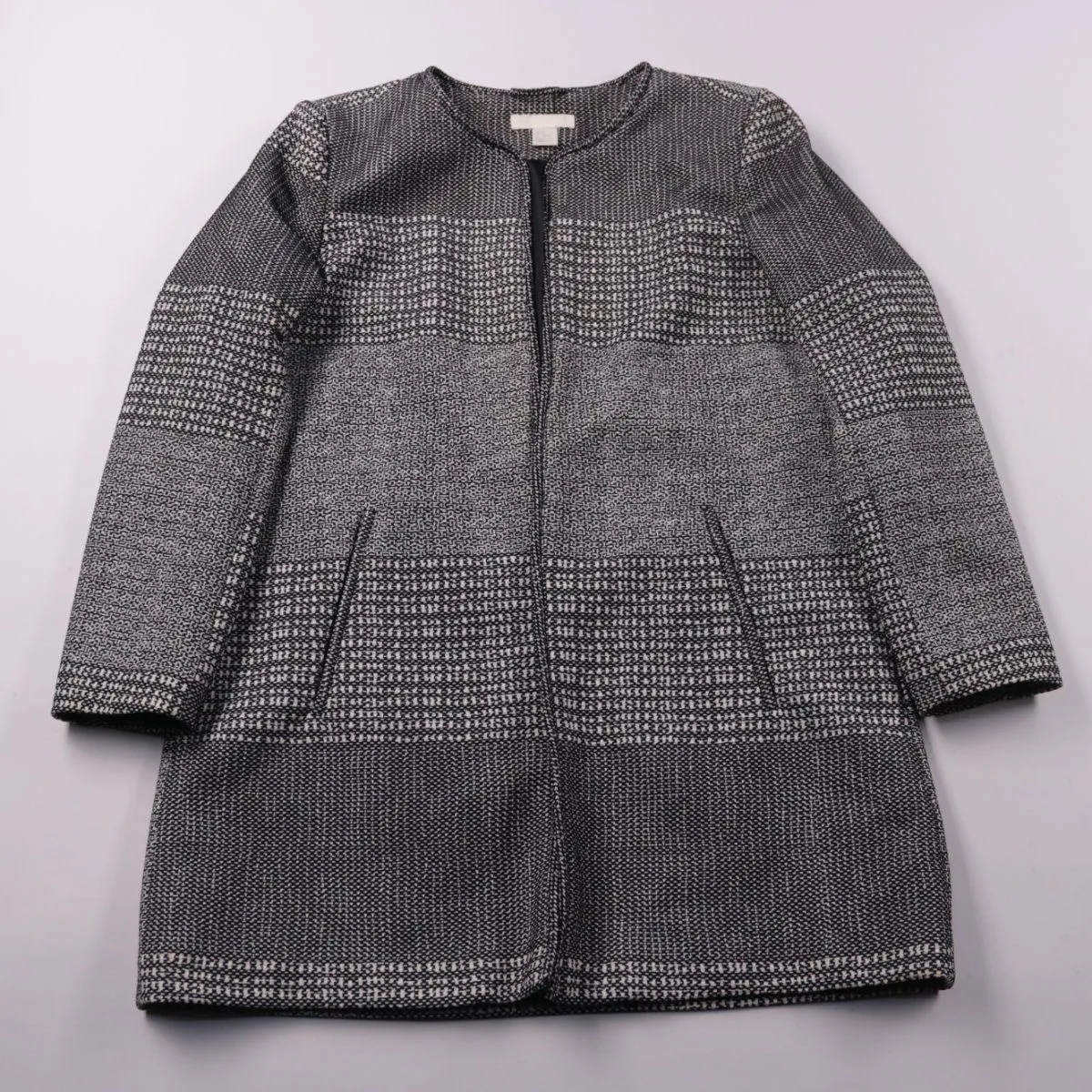 Женское демисезонное пальто H&M из фактурной ткани в серо-чёрной гамме, с круглым вырезом и карманами. Подойдёт для города и офиса в прохладную погоду, легко сочетается с базовыми вещами. Практичный плюс — удобная посадка и простой уход благодаря синтетическому составу.