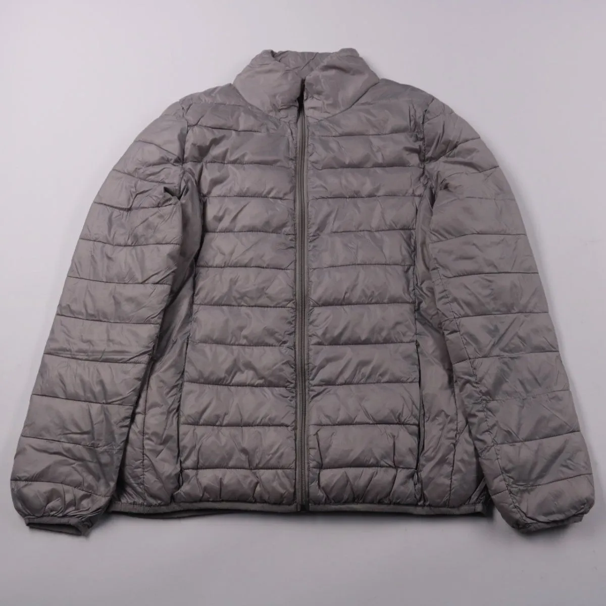 Стёганая демисезонная куртка Blue Motion в сером цвете, на молнии и с высоким воротником. Подойдёт для повседневной носки в прохладную погоду и прогулок. Лёгкая и компактно складывается, удобно брать с собой.