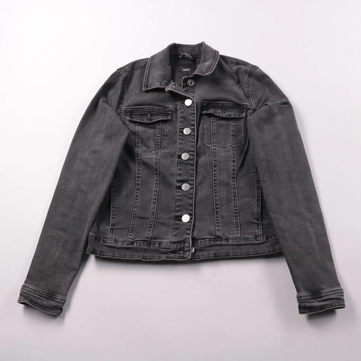 Джинсовая куртка Next в темно-сером (графитовом) оттенке с застёжкой на пуговицы и нагрудными карманами. Подойдёт для повседневных образов в межсезонье и прохладным летом. Плотный деним со стрейчем хорошо держит форму и удобен в носке.