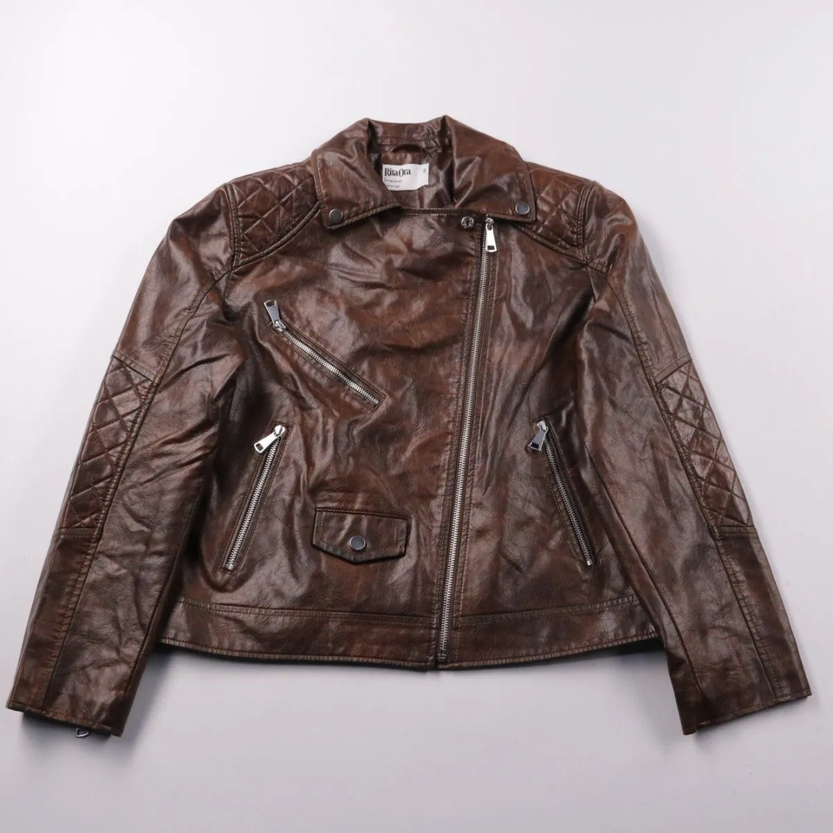 Кожаная куртка-косуха Rita Ora (Primark) коричневого цвета с косой молнией и стёжкой на плечах. Подойдёт для демисезона и прохладных вечеров, легко сочетается с джинсами и платьями. Практичный плюс — несколько карманов на молниях для мелочей.