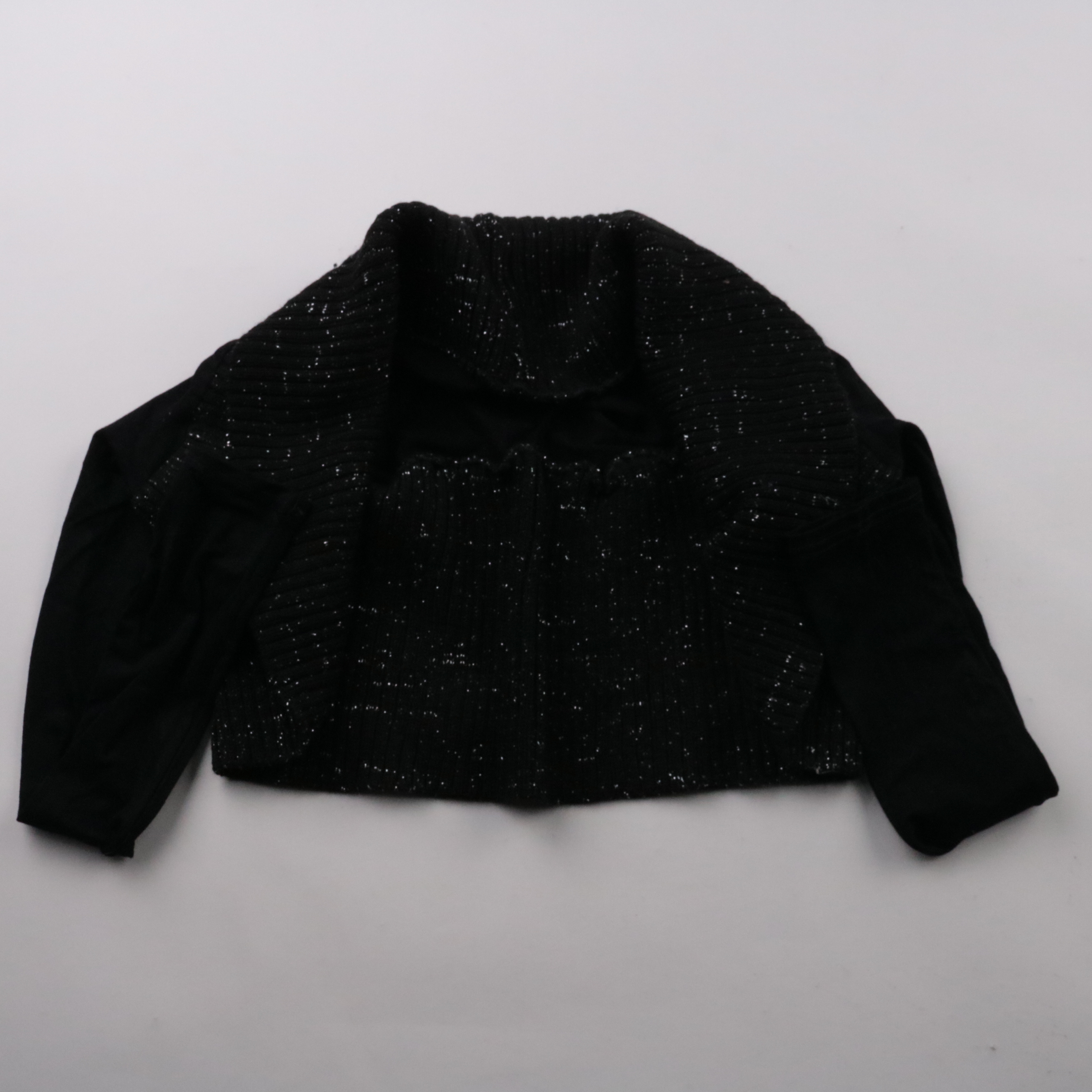 Чёрная укороченная куртка без бренда с фактурной тканью и лёгким блеском. Подойдёт для демисезона и вечерних выходов, хорошо смотрится с платьями и джинсами. Материал плотный и держит форму, поэтому вещь удобно носить как акцент в образе.