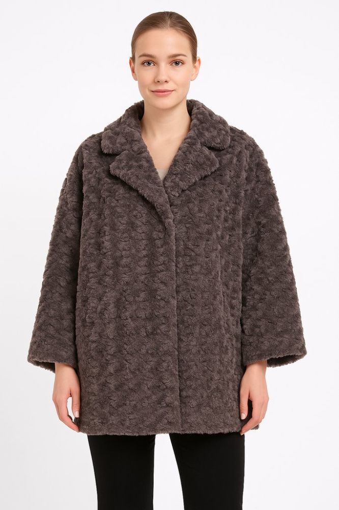 Женская шуба из искусственного меха с фактурной поверхностью и отложным воротником, цвет серо-коричневый (тауп). Подойдёт для зимних прогулок и повседневных образов, легко сочетается с джинсами и платьями. Практичный плюс — материал и подкладка из поли...