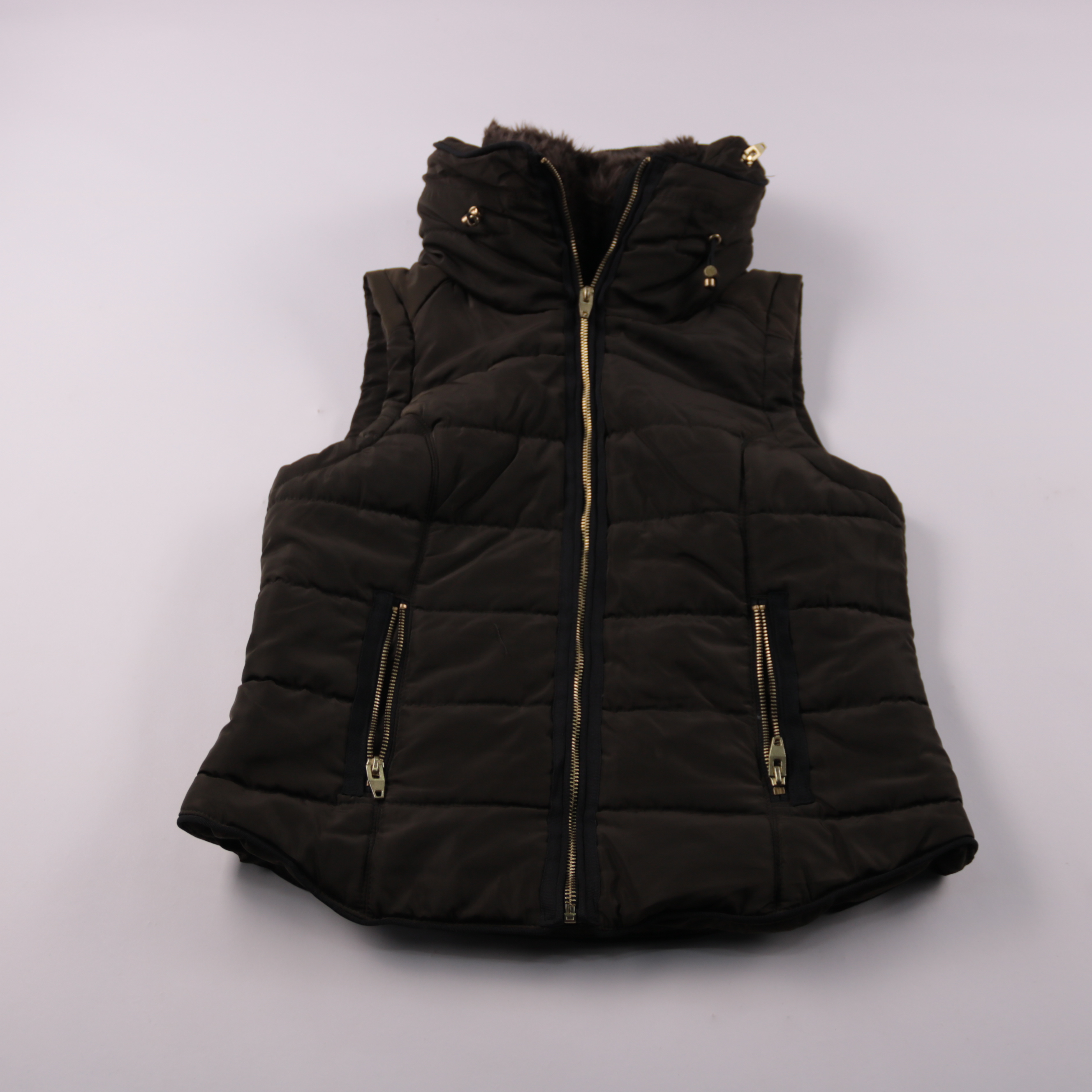 Стёганый женский жилет H&M чёрного цвета с высокой стойкой и воротником с отделкой под мех. Подойдёт для прохладной осени/весны и для многослойных образов поверх худи или свитера. Практичные карманы на молниях и лёгкий уход за счёт полиэстера.