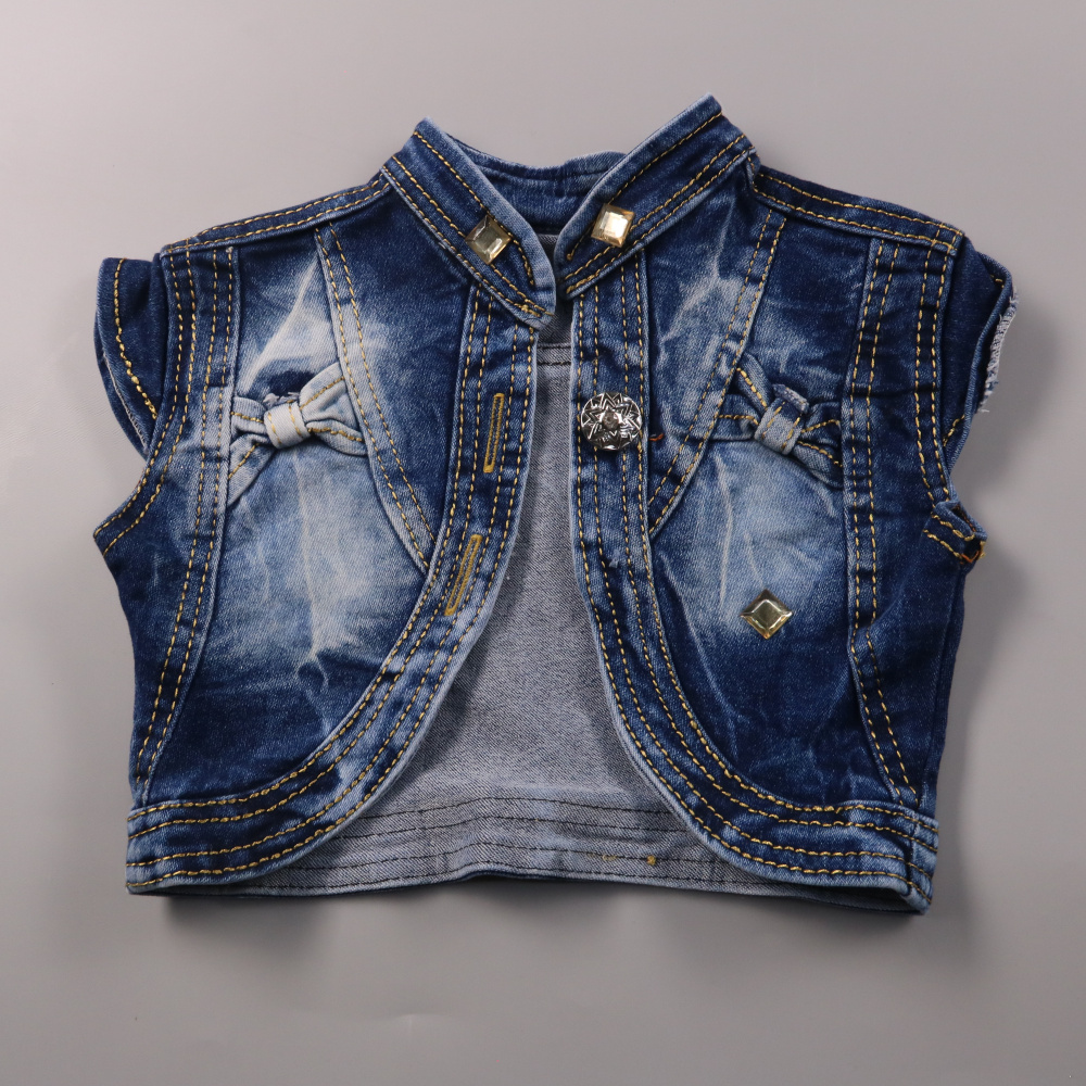 Джинсовый жилет без бренда с декоративными бантиками и металлической фурнитурой. Подойдёт для прогулок и в садик в тёплую погоду или как слой поверх платья/лонгслива. Деним практичный и хорошо переносит частые стирки.