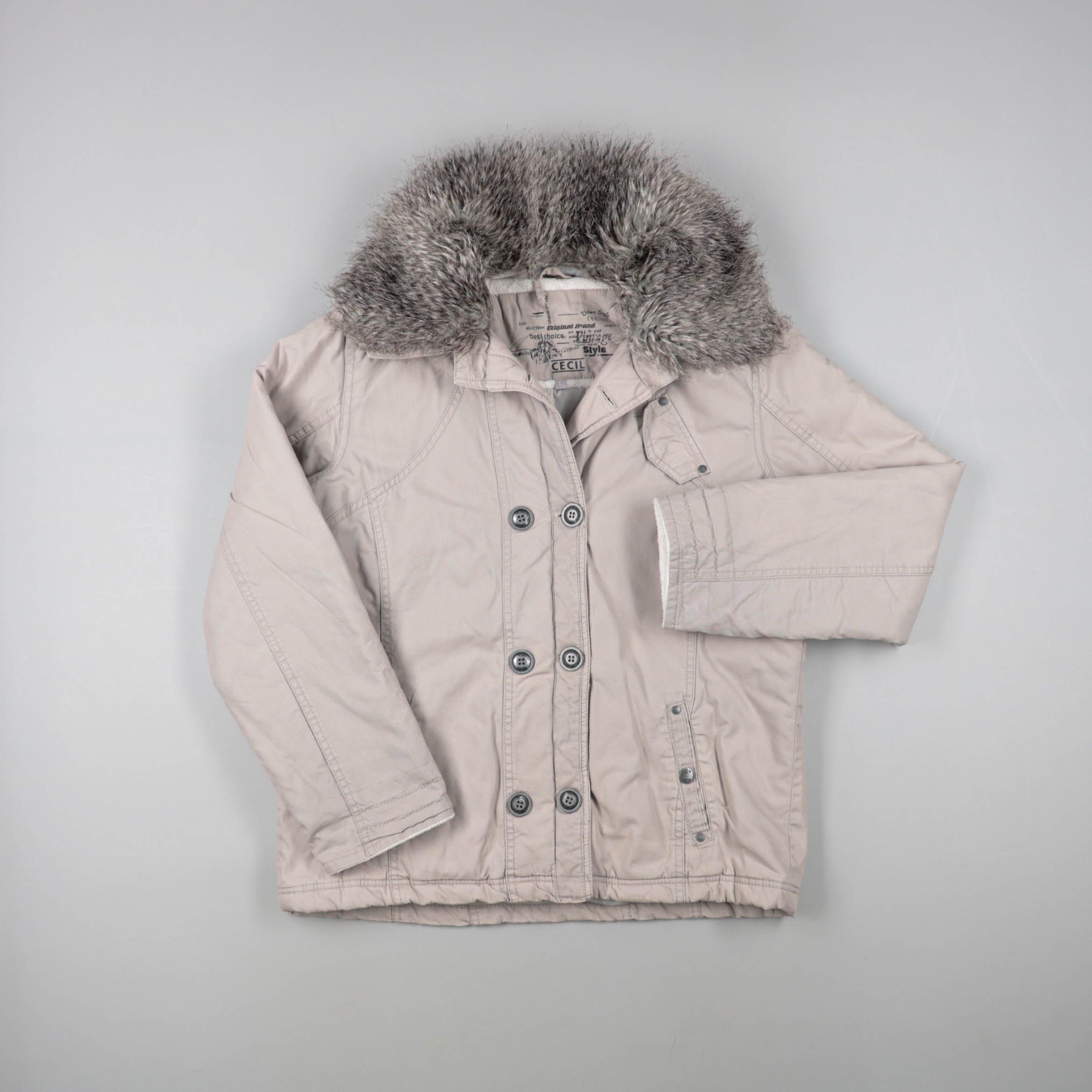 Зимняя куртка Cecil светло-бежевого цвета с пушистым меховым воротником и застёжкой на пуговицы. Подойдёт для повседневных прогулок в холодную погоду, силуэт можно подчеркнуть ремешком на спинке. Практичный плотный верх защищает от ветра, есть карманы ...