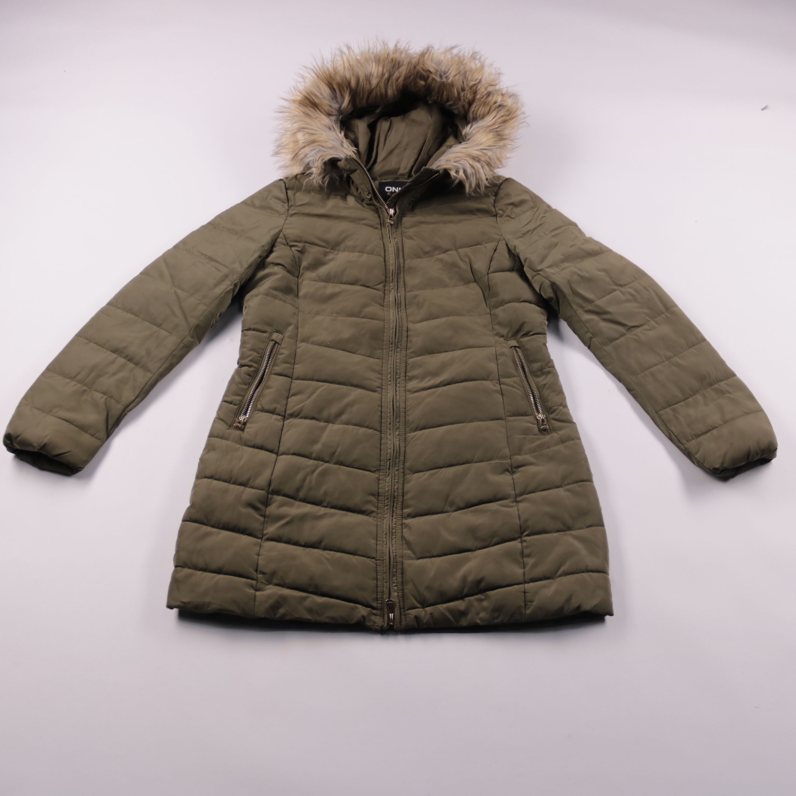 Женская зимняя стёганая куртка Only цвета хаки с капюшоном и опушкой. Подойдёт для повседневных зимних прогулок и дороги на работу, хорошо сочетается с джинсами и ботинками. Практичный плюс — застёжка-молния и карманы на молниях, чтобы вещи не выпадали.