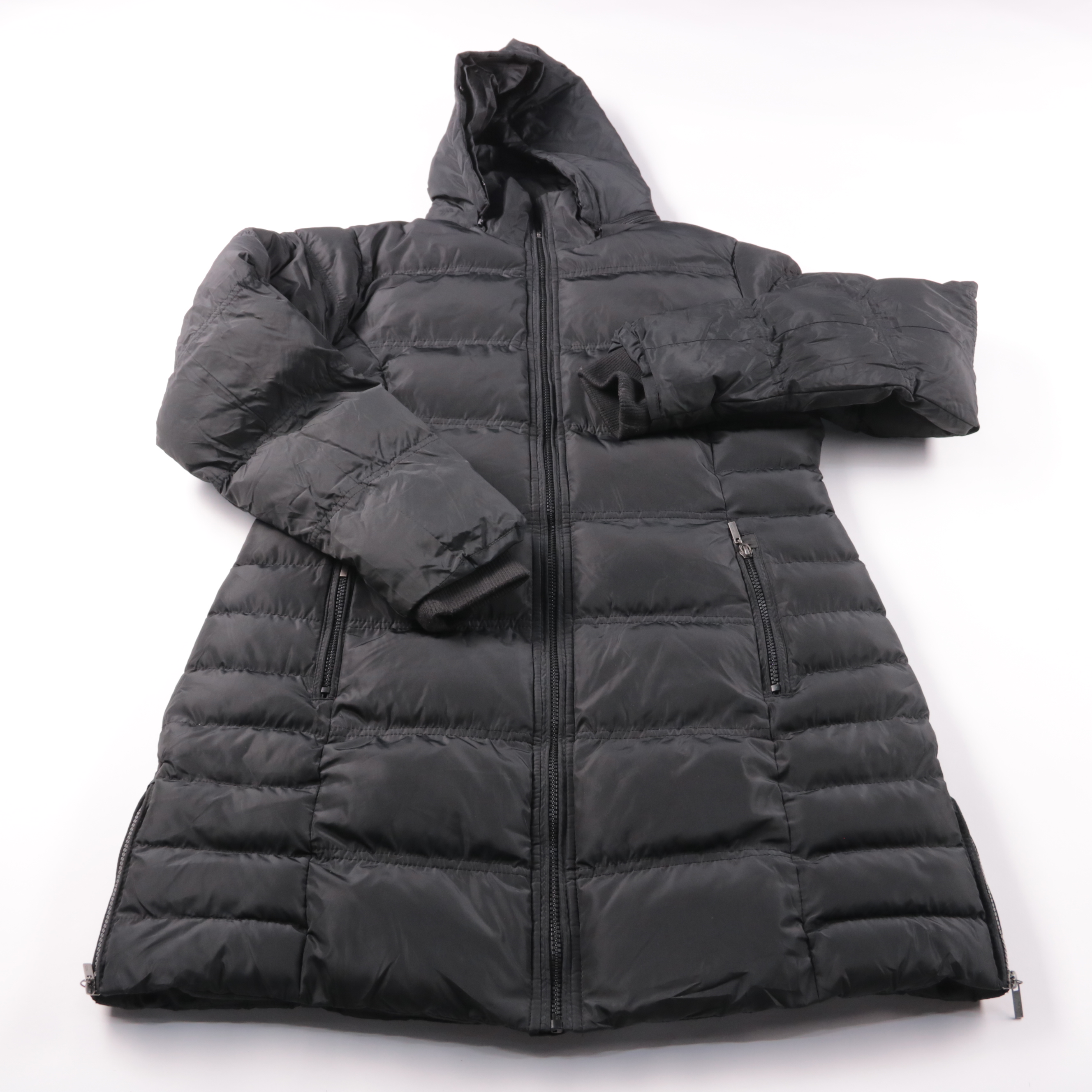 Женский пуховик Jazlyn чёрного цвета с капюшоном и стёжкой, на молнии. Подойдёт для зимних прогулок и повседневных поездок по городу. Практичный плюс — два кармана на молнии и удобная длина, хорошо закрывает бёдра.