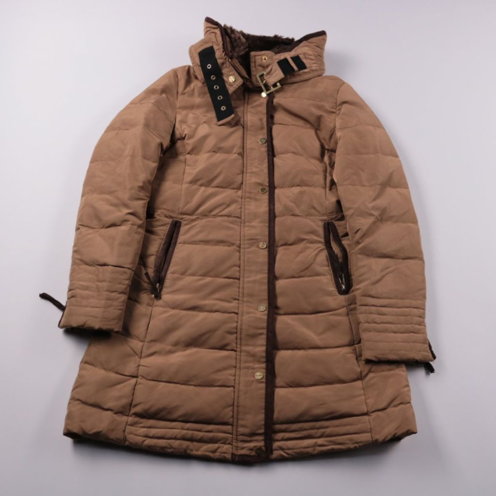 Женский стёганый пуховик Zara Basic бежевого цвета с высоким воротником и декоративными ремешками, подходит для повседневной носки в холодную погоду. Удобная застёжка на молнию и кнопки и два кармана на молнии защищают от ветра и помогают держать мелоч...