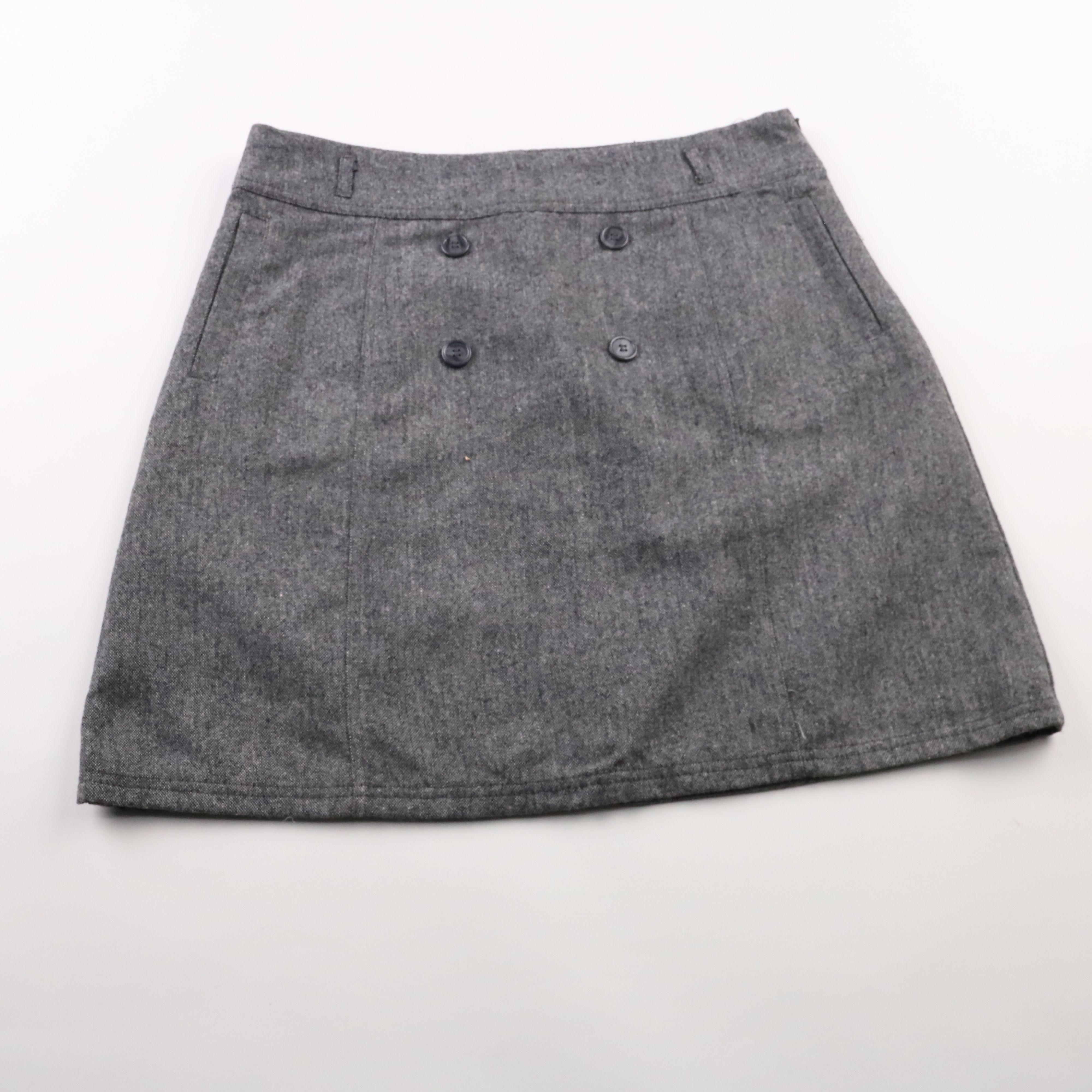 Юбка United Colors of Benetton серого цвета, короткая, с двойным рядом пуговиц спереди и карманами. Подойдёт для повседневных образов и офиса в сочетании с рубашкой или свитером. Плотная ткань держит форму и комфортно носится.