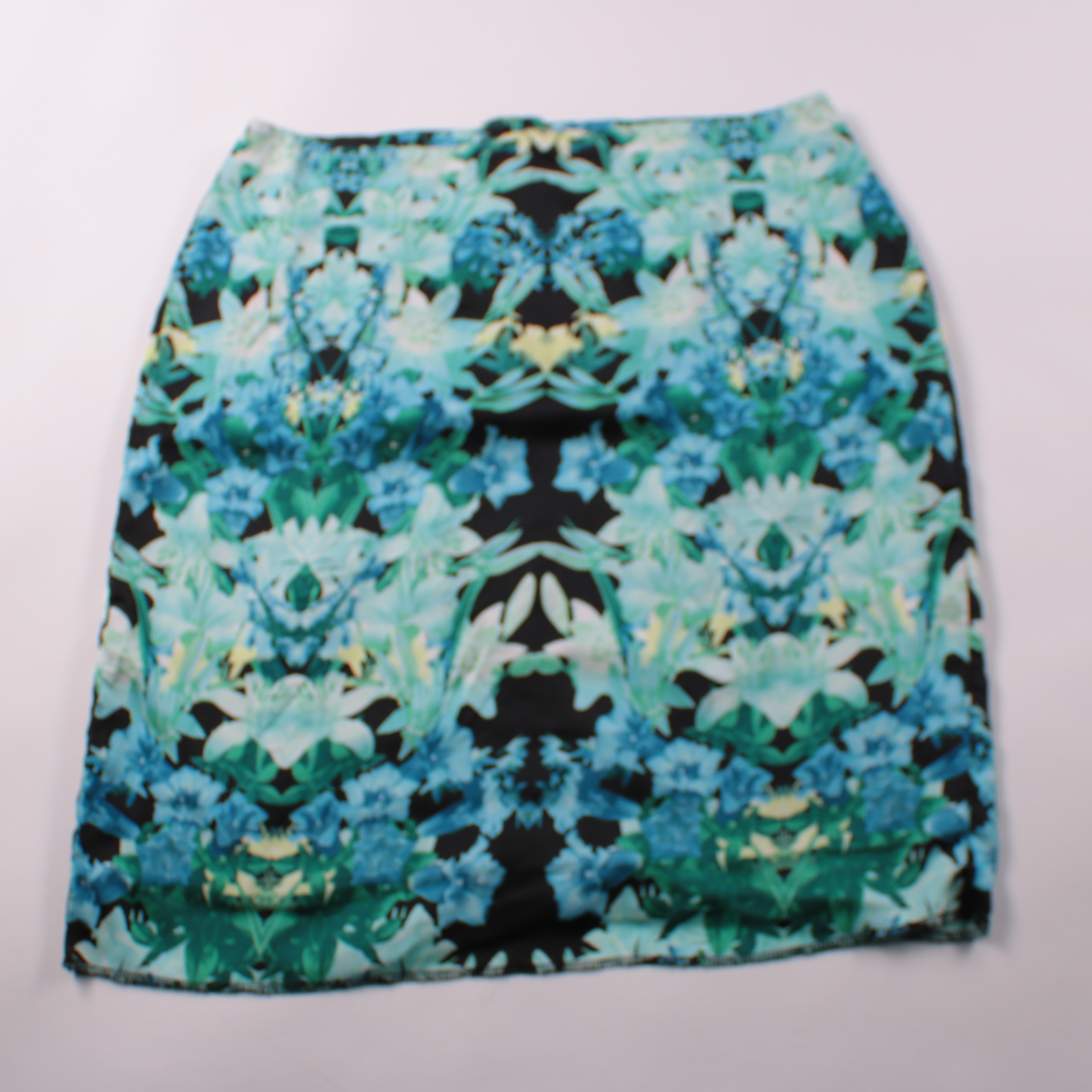 Юбка с цветочным принтом в зелёно-голубой гамме на чёрном фоне, размер 16. Подойдёт для повседневных образов и офиса с однотонным верхом. Материал со стрейчем комфортно садится по фигуре и не сковывает движения.