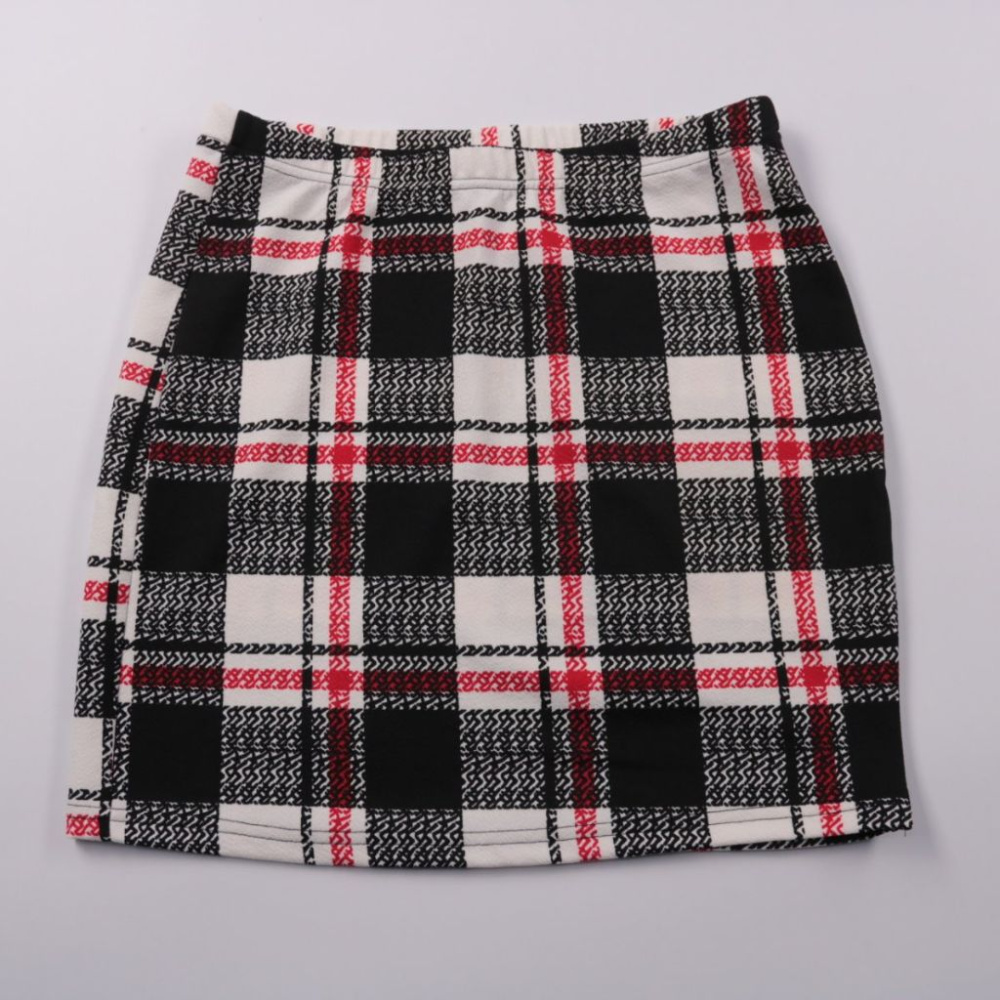 Юбка Shein прямого кроя в клетку (чёрно-бело-красный принт). Подойдёт для повседневных и офисных образов с базовым верхом и обувью на плоском ходу или каблуке. Практичный плюс — плотный материал почти не мнётся и хорошо держит форму.