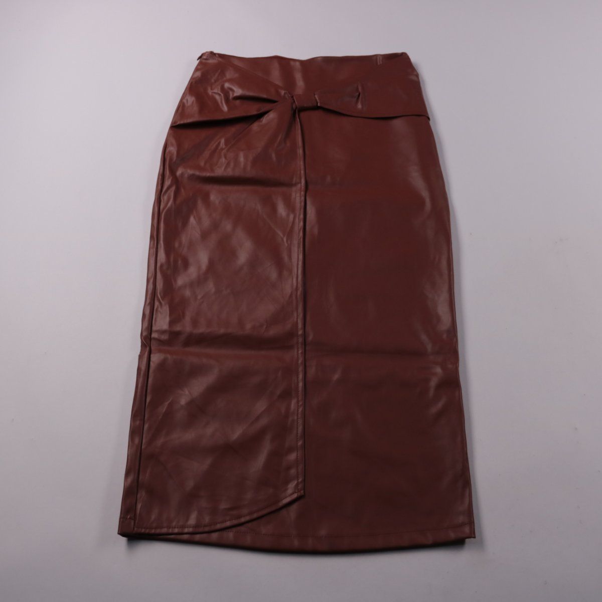 Юбка SHEIN миди из гладкого материала под кожу, коричневого цвета, с запахом и разрезом спереди. Подойдёт для повседневных и офисных образов в демисезон. Практичный плюс — легко протирается и не требует сложного ухода.